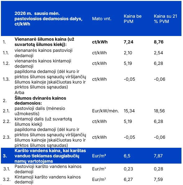 2026 m. šilumos ir karšto vandens kainos