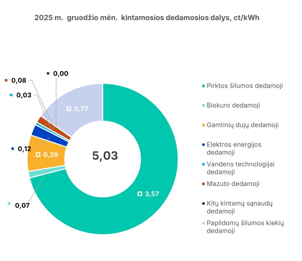 Gruodį „Klaipėdos energijos“ tiekiama šiluma Klaipėdos ir Gargždų gyventojams kainuos 6,80 ct/kWh (be PVM) arba 7,41 ct/kWh (su 9 proc. PVM). Tai apie 12 proc. daugiau nei lapkritį, kai šilumos kaina siekė 6,05 ct/kWh (be PVM) arba 6,59 ct/kWh (su 9 proc. PVM) ir beveik 2 proc. daugiau nei prieš metus – 2024-ųjų gruodį šiluma kainavo 6,68 ct/kWh (be PVM) arba 7,28 ct/kWh (su 9 proc. PVM).